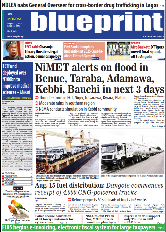 - NiMET alerts on flood in Benue, Taraba, Adamawa, Kebbi, Bauchi in next 3 days